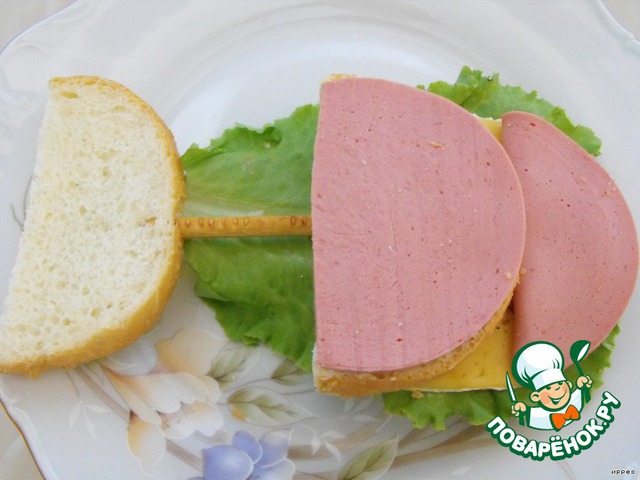 Кружок колбасы сложить пополам и уложить на бутерброд. Это будет "рот".