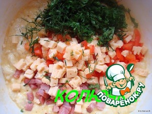 Начинку засыпаем в тесто, солим, перчим и перемешиваем.