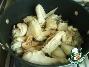 В толстостенной посуде (кастрюле, глубокой сковороде или казанке) разогреваем растительное масло и опускаем туда кусочки курицы. Обжариваем до лёгкой румяности -