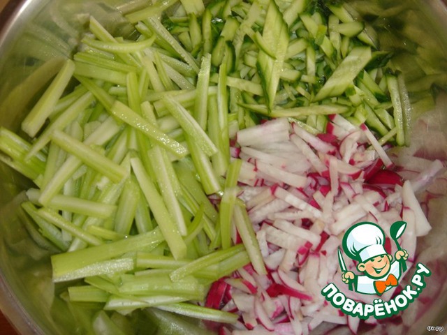 Чтобы выдержать вечер в японском стиле, пришлось поэкспериментировать и с салатами. Привычные нам застольные "Оливье" и "Шубы" никак не вписывались в общую картину вечера. Представляю на Ваш суд салат из древесных грибов, сельдерея, редиса, огурцов и микса из водорослей. Очень свеженький, сочный салатик. Гостям очень понравился.