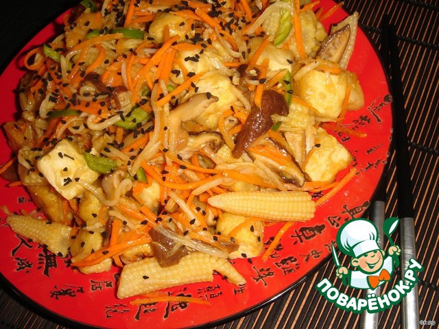 К овощам добавить кукурузные початки (если крупные порезать наискосок на кусочки), тофу, заправить соусом, перемешать.