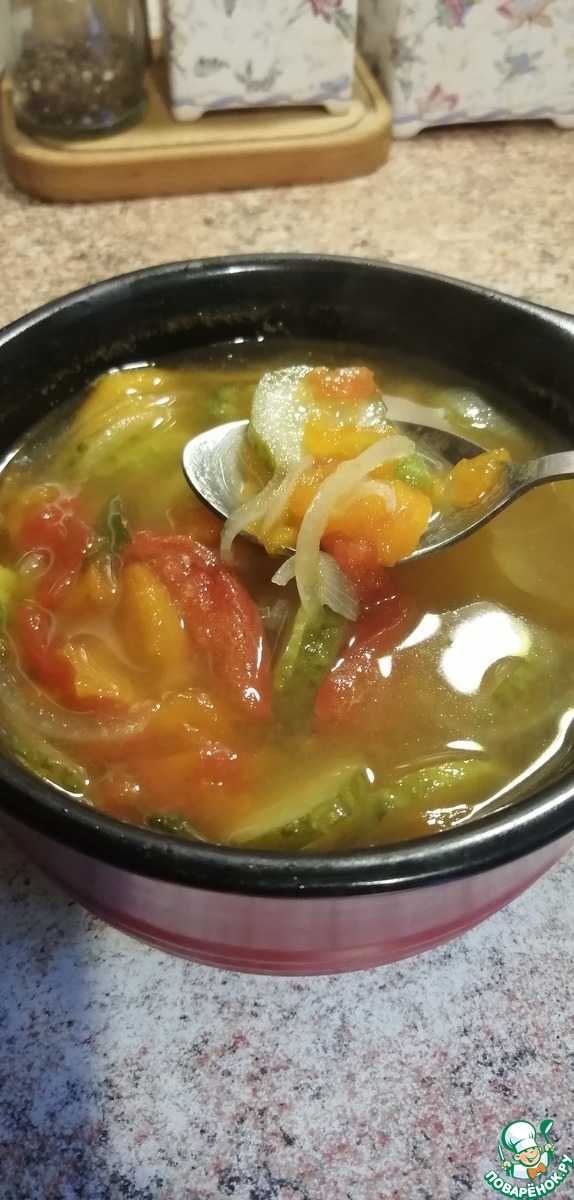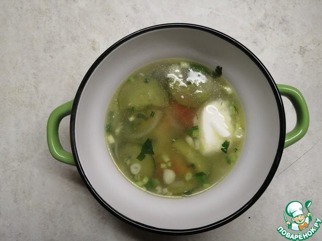 Ничего не обжариваем!!! Вода закипела, бросаем в нее нарезанные овощи (все сразу, ну только если картошка или морковь не молодая, то минут на 5 – 10 пораньше). Минут через 10 добавляем соль, по вкусу, и кладем сливочное масло. Пряности я не добавляю, овощи все молодые, и так получается очень ароматно. Варим еще минут 10 – 15. Обязательно добавляем в тарелку сметану, также хорошо нарезать зелень. К нему – ржаной хлеб и, если любите, чеснок, рекомендую дольку – все получается очень вкусно, полезно, и за фигуру не обидно)))