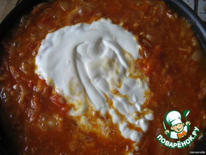Когда помидоры размякнут, вылить туда пачку сметаны и еще потушить, долив воды. Посолить, поперчить