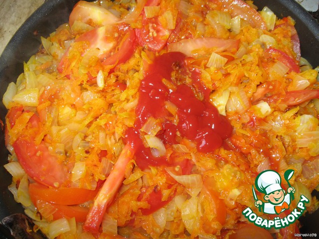 В оставшуюся смесь поджарки нарезать помидоры и положить пару ложек томата или кетчупа, продолжать тушить