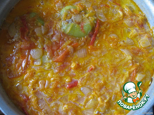 Залить всем этим поджидающие нас перцы (если не хватит, долить воды, так чтобы жидкость закрыла всю поверхность).