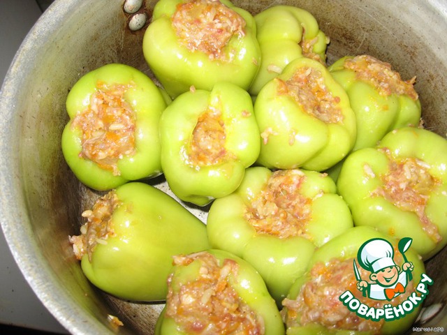 нафаршировать перцы полученной смесью и уложить их в толстостенную кастрюлю -