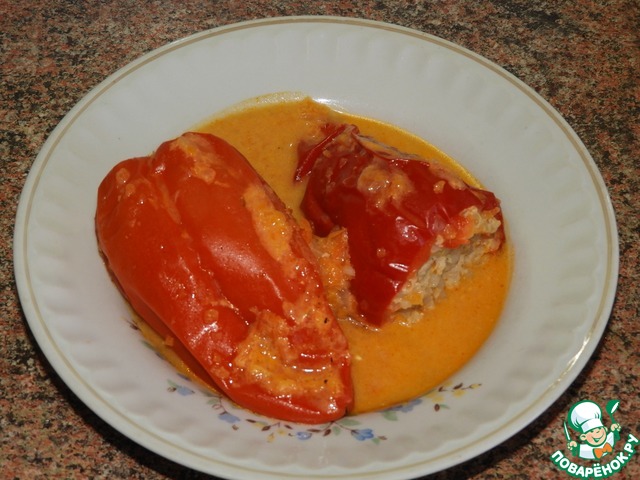 4. Подливки очень много не хватило, пришлось доливать 750 мл воды. Из-за этого вкус изменился, стал сильно водянистым. Пришлось уже в кастрюле на ходу корректировать солью и сметаной. И срочно бежать за ещё одной пачкой 450г сметаны (итого ушло сметаны 900г только в подливу, а в тарелки уже ничего не останется). В итоге всё равно полностью перцы не покрыты.