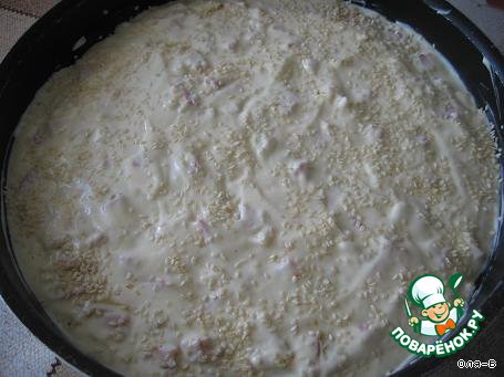 Сверху вылить вторую часть теста, распределить. Можно посыпать кунжутом.