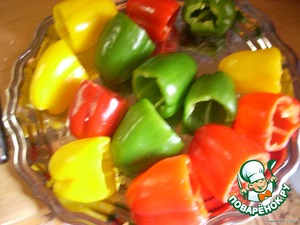 каждый перец завернуть в фольгу и запечь 15 минут. Остудить и снять кожицу. (у меня это не получилось, но от этого блюдо не стало хуже)