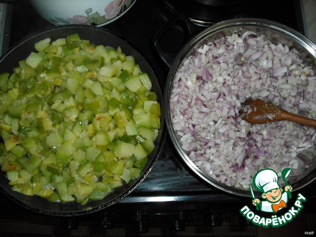 4. Кабачки поджарить на подсолнечном масле. Лук пожарить до золотистого цвета на подсолнечном масле. Желательно жарить в разных сковородах!