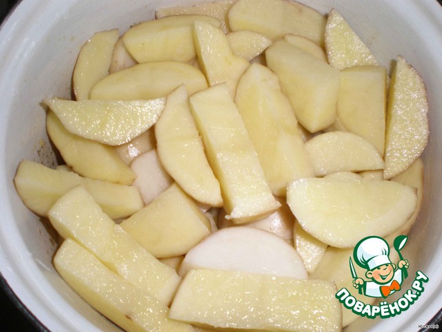 В эту же емкость выложите картошку, нарезанную дольками. Налейте 0,5 ст. воды, поставьте на огонь и доведите до кипения. Добавьте перец, соль. Кастрюлю накройте крышкой и тушите на медленном огне около 40 мин.