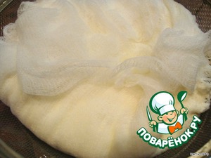 Теперь массу откидываем на марлю и даем жидкости стечь. Никакого пресса! Через час рикотта готова. Если выдерживать дольше, она станет сухой. Это нам совсем не нужно.