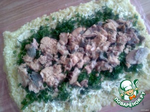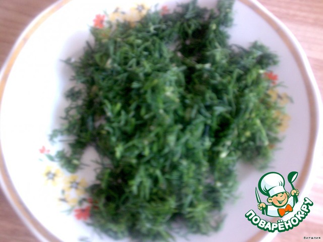 Посыпать луком и укропом, и выложить горбушу кусочками.