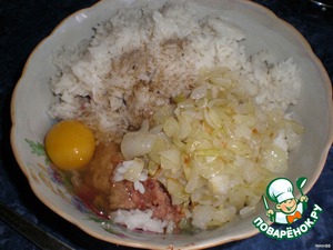 Мясо, рис, жареный лук смешать, добавить соль, молотый перец и яйцо. -