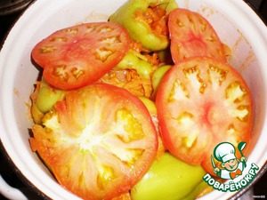 Перец заливаем соусом (на 1 сантиметр выше верхнего слоя; если не хватает соуса - доливаем кипятком), укладываем помидоры, ставим на огонь, доводим до кипения и накрываем крышкой.