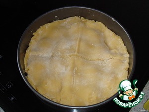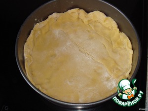 Тесто разделить на 2 части. Каждую часть раскатать по форме противеня толщиной 5 мм. Один слой выкладываем на противень, делаем бортики.