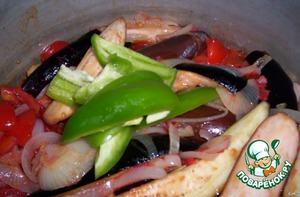 - добавить болгарский перец, горький перец , зелень, чеснок, перемешать, протушить 10 минут