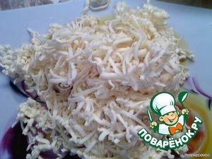 Затем натираем сыр и также отправляем его на сковородку буквально на 1 минутку. Можно использовать твердый сыр, хотя я делала с плавленым сырком и получилось тоже очень вкусно.