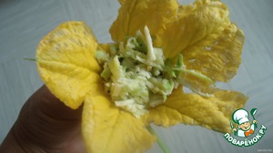 Цветы фаршируем: цветочек берём в левую руку (левша в правую), если он закрылся, то насильно раскрываем... и кладём в серединку 1-2 ч.л. начинки. Кончики лепестков слегка скручиваем, что получился как бы "фунтик" - на фотке будет видно! Кстати, нафаршировать можно накануне - я их ночь продержала в холодильнике.