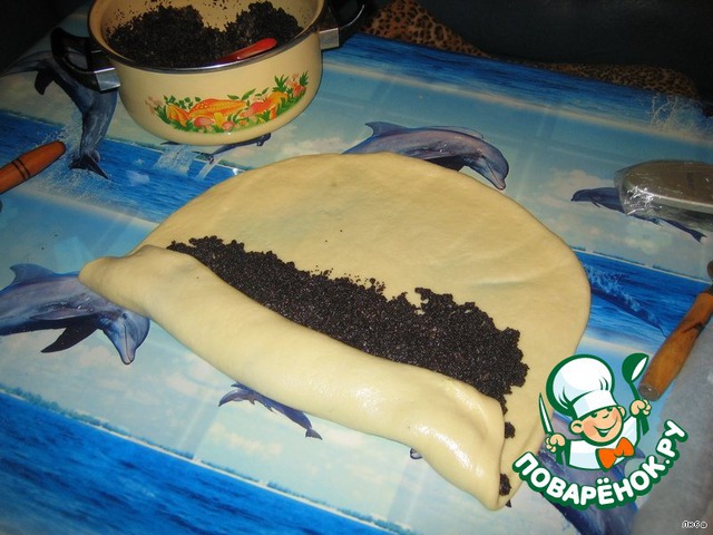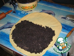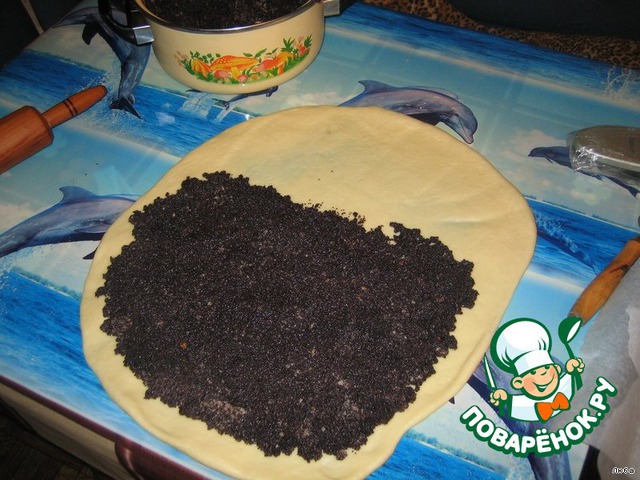 Затем раскатываю тесто и кладу начинку, делаю рулеты.