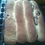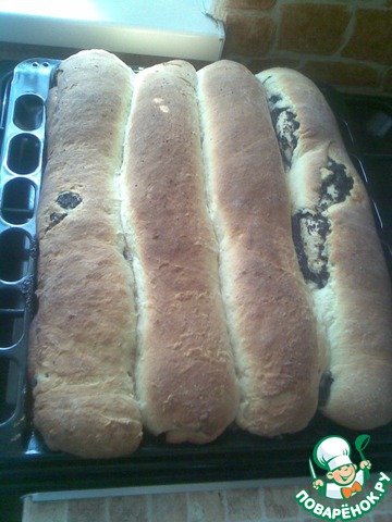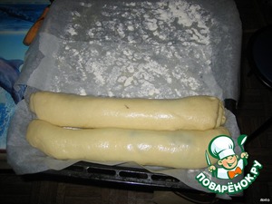 Уложили плотно друг другу и смазываем яйцом (я укладываю на пергамент, смазанный маслом и присыпанный мукой).