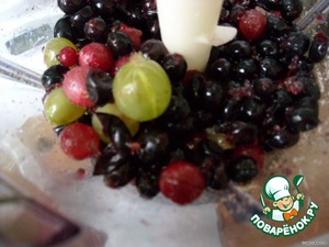 Далее выложить слой крыжовника, который я предварительно взбила в пюре в блендере (скажу, что 300 г это очень мало, т.к. по рецепту надо промазывать все коржи, а у меня хватило только на один, так что лучше брать 1 кг)