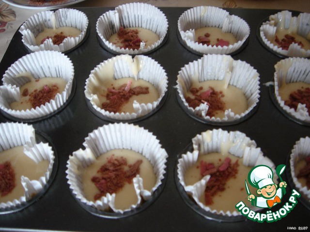 В форму для выпечки ,если имеются ,выложить бумажные корзиночки и наполнить их тестом на 1\\\\4 часть, затем положить измельченные конфеты и небольшие кусочки шоколада.