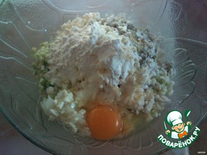 Туда же положить муку, яйца, соль, перец и порезанный укроп. -