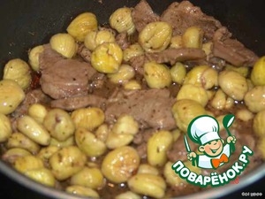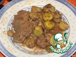 (Каштаны можно отварить и подать отдельно от мяса или заменить на гарнир из отварного картофеля.) Тушить под крышкой до готовности. За несколько минут до окончания тушения добавить портвейн. Довести до кипения. Отключит и подать к столу.