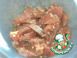 Промыть и просушить вырезку, порезать кубиками 4х4см. Посолить, поперчить, посыпать молотой (лучше крупного помола) паприкой, рубленным чесноком и молотым лавровым листом. Лавровый лист можно измельчить в ступке. Полить белым вином и оставить на 1 час.