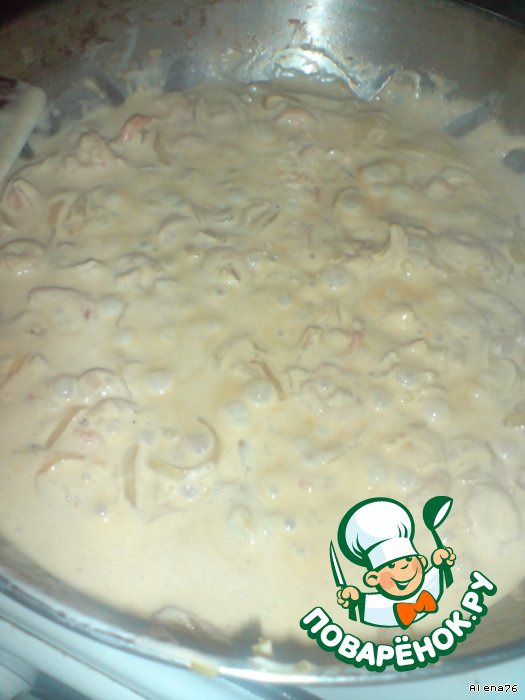 После этого залить сливками, добавить карри и абрикосовый джем и протушить на медленном огне минут 10.