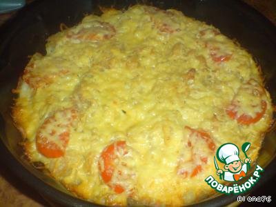 Выкладываем рыбу во что-то, заливаем соусом с креветками, выкладываем помидорчики (можно без них) и щедро засыпаем сыром.