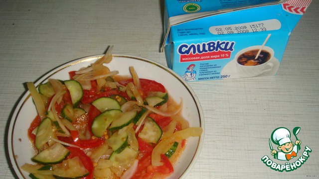 Овощи (помидор + болг. перец + огурец + лук) - мелко порезать или измельчить в блендере и смешать со сливками.