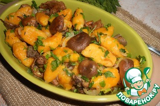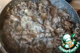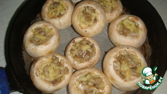 Смешать обжаренные ножки с сыром и каперсами, и этой смесью плотно нафаршировать шляпки. Затем сложить на сковородку и дать постоять на маленьком огне 5 минут.