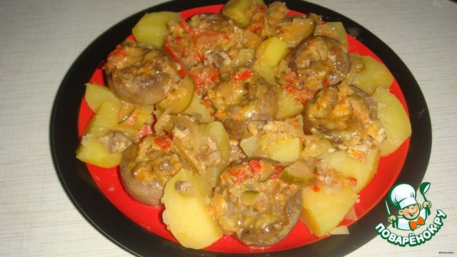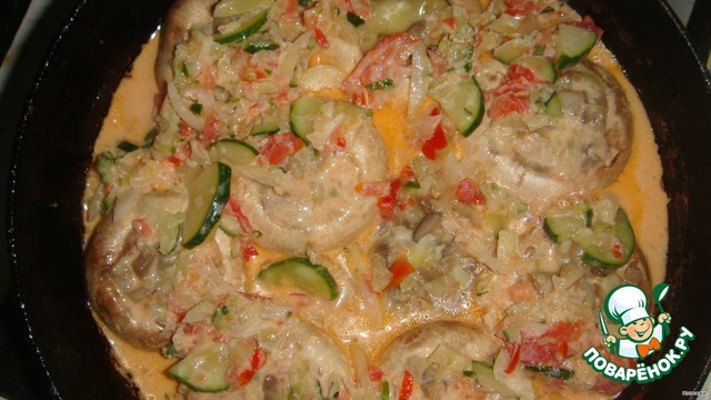 Целенькие шампиньоны, нафаршированные сыром и грибочками, в соусе из овощей. Можно отлично использовать остатки овощного салата (для соуса). Блюдо сочетается с картофелем, рисом, макаронами... проще говоря, практически с любым гарниром! Особое предпочтение блюду отдают мужчины!