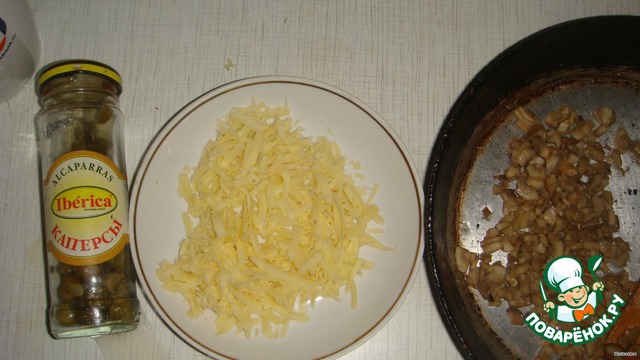 сыр натереть на тёрке. Каперсы мелко порезать.