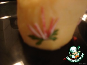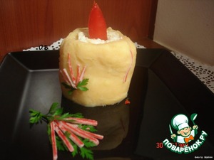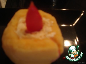 Сделать из картофеля форму и уложить порезанные крабовые палочки, креветки, икру(у меня не было, обошлась так, но если есть не пожалейте, будет вкуснее), желток и белок потерла на терке. Белок полила оставшимся соком моркови. Из крабовых палочек сделала украшение, из красного перца огонь. Ножом сделала полоску и уложила в нее полоску от крабовых палочек, делая вид как потек свечи.