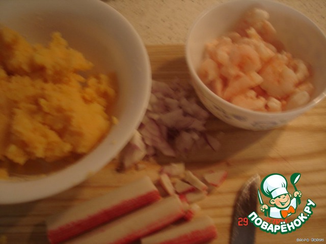 порезать лук мелко,крабовые палочки,креветки
