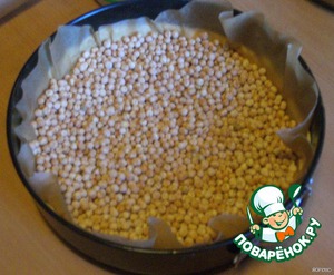 Сверху на тесто кладем бумагу для выпекания, а на бумагу насыпаем сухой горох или фасоль (это нужно для того чтобы не потерялась форма и при выпечке не поднялась середина коржа).