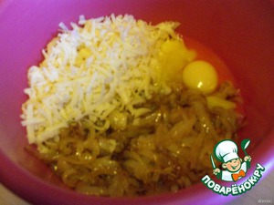 Сыр натираем на крупной терке. Смешиваем поджаренный лук, сыр и яйца.
