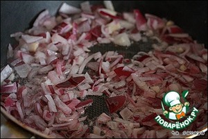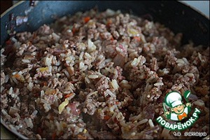 После чего на сковородке вместе с луком обжариваем фарш, отваренный рис и мелко нарезанные шампиньоны.