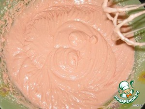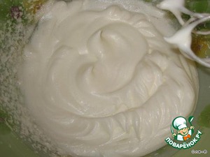 Затем добавить белки к сметанно-масляной смеси и смешать на низкой скорости, всыпать муку, еще раз хорошо перемешать, до однородной консистенции.