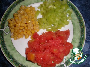 Перец и помидоры моем и нарезаем мелким кубиком.С кукурузы сливаем воду.