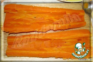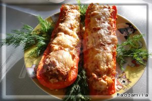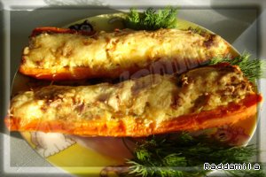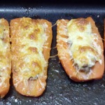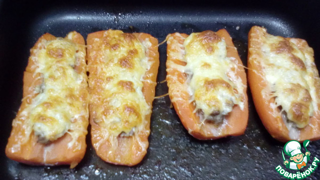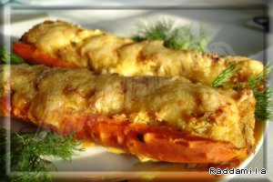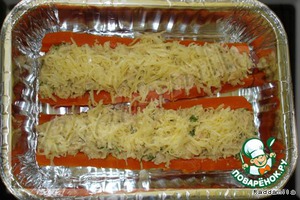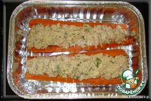 [+5]Внесла некоторые изменения: на лодочку из моркови выложила фарш с сушеным чесноком и солью, сверху смазала тонким слоем любимого майонеза моего мужа и обильно посыпала тертым сыром.