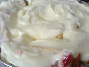 Горячие рулеты разрезать на кусочки 3-4 см, поместить их ветикально в разъемную форму для торта переслаивая сметанным кремом.