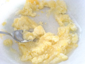 Яйцо растереть с сахаром и сливочным маслом.