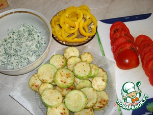 Кабачки почистить (можно использовать цукини, тогда будет более эффектный зеленый цвет), присолить, обвалять в муке и пожарить. Выложить на бумажное полотенце, чтобы убрать лишнее масло. Сладкий перец порезать кольцами, помидоры – кружочками.