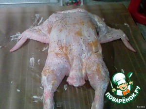 Укладываем подготовленную тушку на пергамент, обмазываем смесью сметаны и майонеза, смешанной со специями