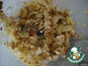 Муку смешать с содой, сахаром, корицей, измельченным миндалем, измельченным ананасом и стружкой, перемешать.