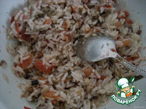 Готовим фарш: рис отварить, добавить измельченный чеснок, размятые шпроты, нарезанный помидор, перемешать.